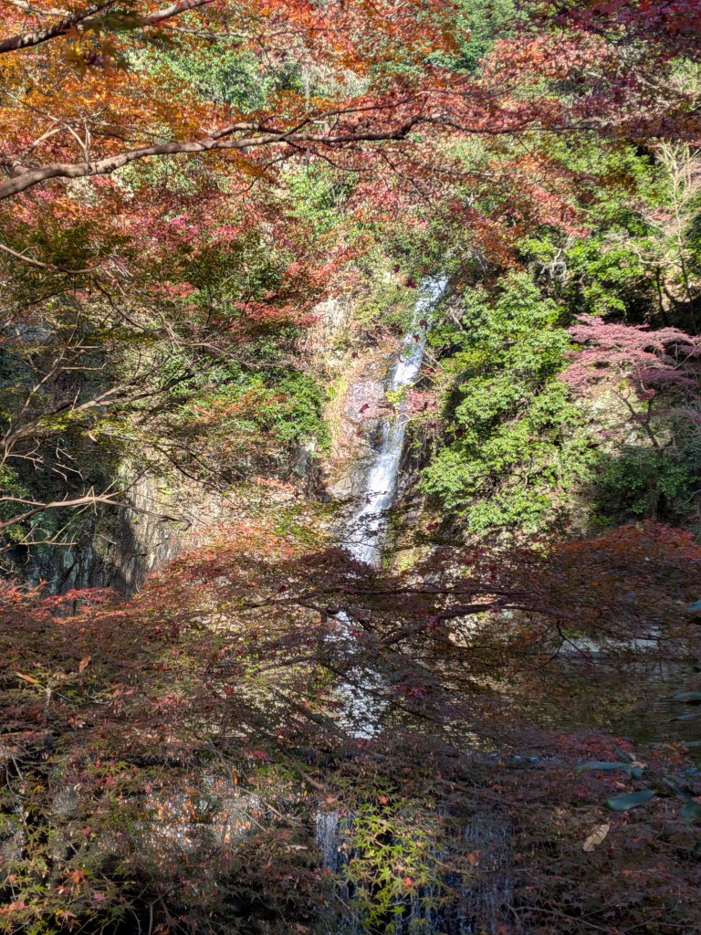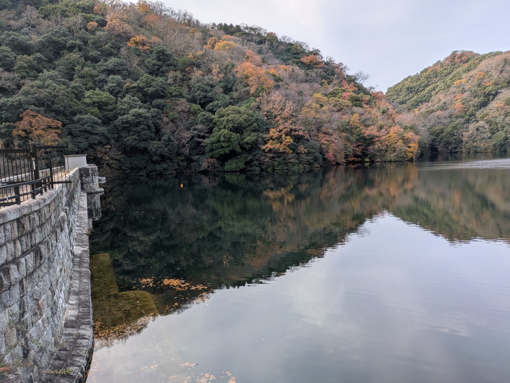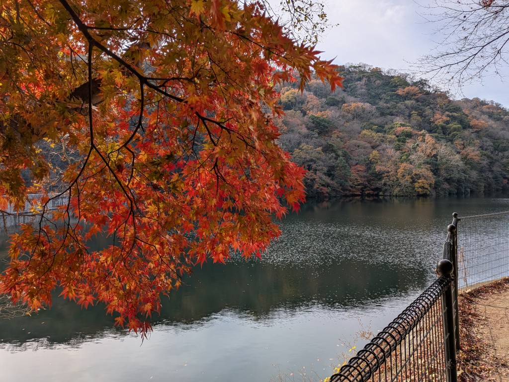 布引の滝から貯水池へ。貯水池の周りは紅葉が見事だった! 赤や黄色に色づいた木々が、青い空と水面に映えて美しい。登山開始から1時間が経過したが、景色に見とれながらの登山は疲れを感じさせない。
