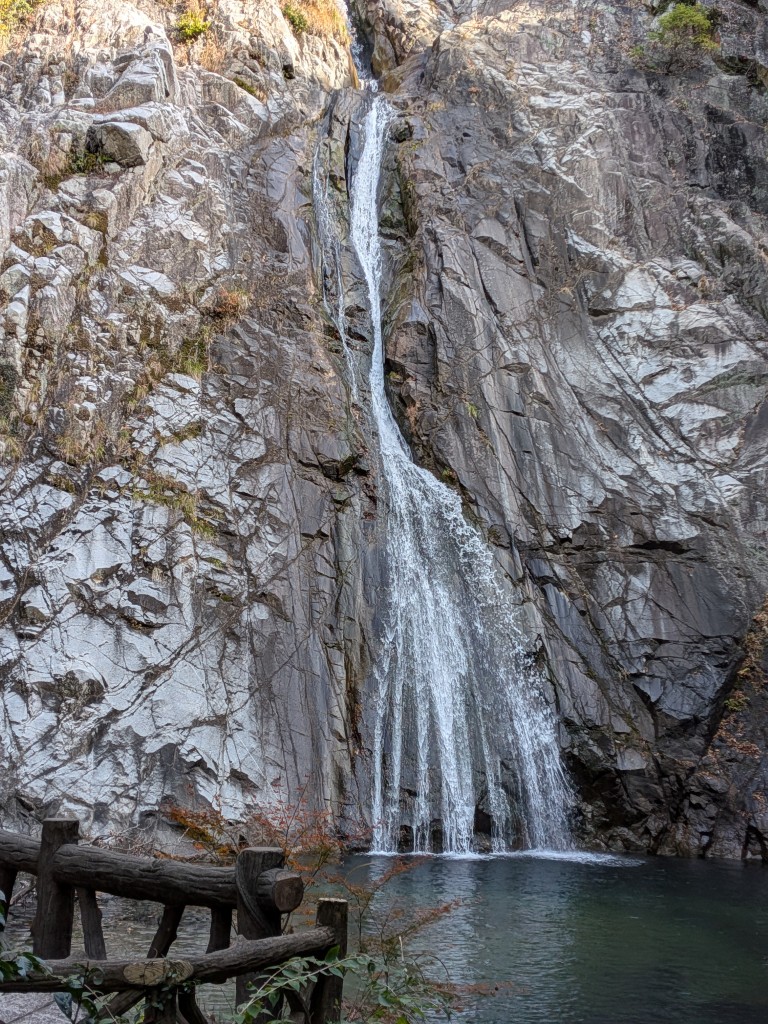 登山開始から30分。布引の滝に到着! まずは雌滝、そして雄滝と、水の流れる音に癒やされる。快晴の日差しに照らされた滝が美しい。滝のマイナスイオンを浴びながら、しばし休憩。登山のスタートから、こんな素敵な景色に出会えるとは幸先がいい。