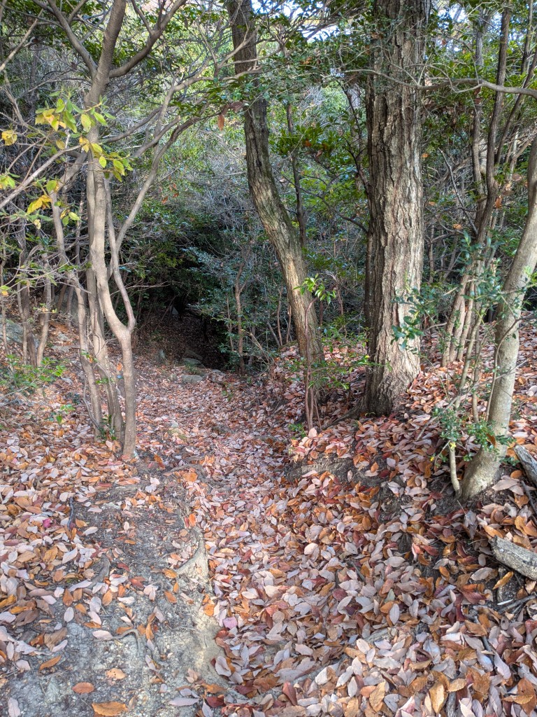 下りの辛さが本格化。膝への負担が大きく、かなりしんどい。急坂と落ち葉の組み合わせは、登りよりも下りの方が何倍も大変だということを、身をもって実感している。