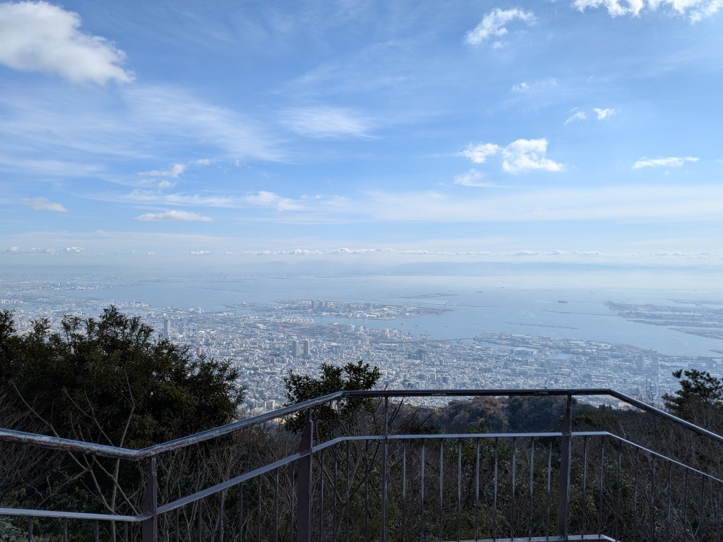 そして、この景色が最高だった! 快晴の空の下、眼下には神戸の街並みが広がり、大阪湾、そして遠くは大阪市街まで見渡せる。「掬星台(きくせいだい)」の名前の通り、まるで星を掬えるほど高い場所にいる気分だ。