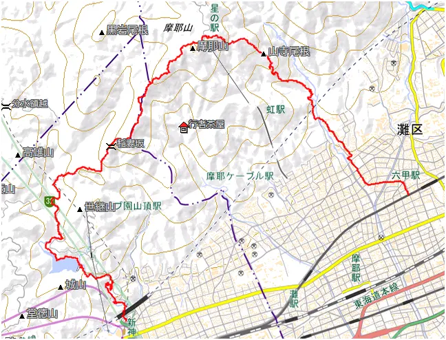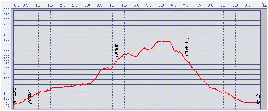 道程:[1] 新神戸駅→[2] 布引の滝→[3] 桜茶屋→[4] 掬星台→[5] 山寺尾根→[6] 護国神社→[7] ふじ温泉